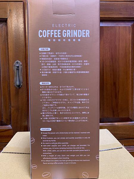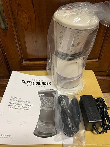 盒子內全部的東西:磨豆機、說明書、電線、車充。